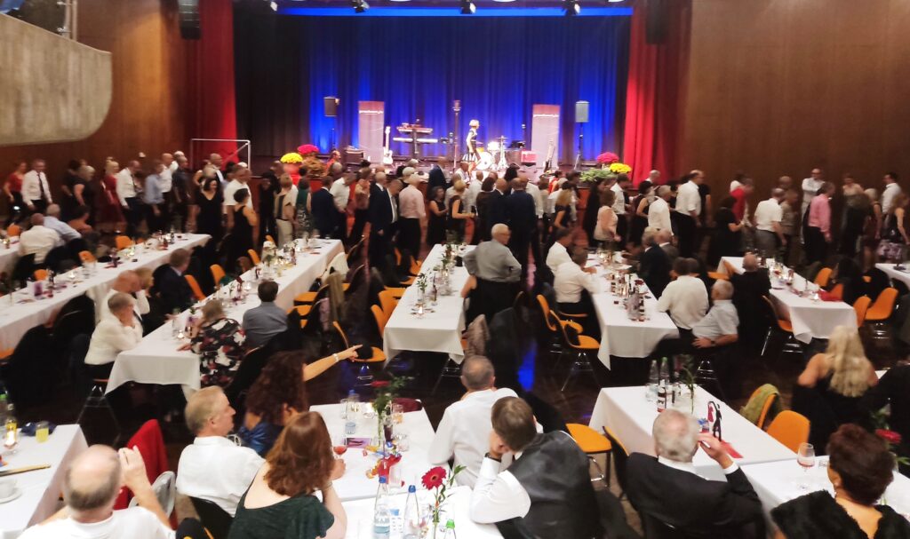 Einfach nach Lust und Laune wieder einmal ausgiebig tanzen! So ließe sich die Devise beim glanzvollen Ball in Metzingens Stadthalle am vergangenen Samstag beschreiben. Runde um Runde strömten die festlich gekleideten Paare auf die Tanzfläche. Samba, Rumba, Walzer, Tango, Cha-Cha-Cha…  – zu den Klängen und Rhythmen der Standard- und Lateintänze genossen die Gäste ganz offensichtlich den Spaß an der Bewegung zu zweit. Volle fünf Stunden lang gab es Programm in der stilvoll zum glamourösen Ballsaal dekorierten Stadthalle. Kein Lieblings-Tanzstil kam da zu kurz.  Ausreichend Platz zum Schwingen, Steppen und Drehen der vielfältigen Tanzfiguren fanden die Tänzerinnen und Tänzer auf dem Parkett im Saal vor der Bühne – vom Hausmeister eigens frisch poliert! –  und auch das Foyer wurde eifrig betanzt.