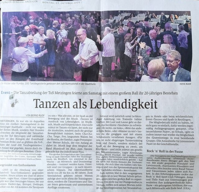 Für alle Tanzinteressierten hatte die TuS Metzingen im Januar 2005 die Abteilung Tanzsport gegründet. Eine Idee, die absolut boomte: Mit 18 Paaren ging die Abteilung einst bei der Gründung an den Start – inzwischen treffen sich vier Gruppen mit mehr als 60 tanzbegeisterten Paaren je einmal wöchentlich, um unter fachkundiger Anleitung durch die Trainerin Sabine Gärtner mit Lust und Laune das berühmte „Tanzbein“ zu schwingen.