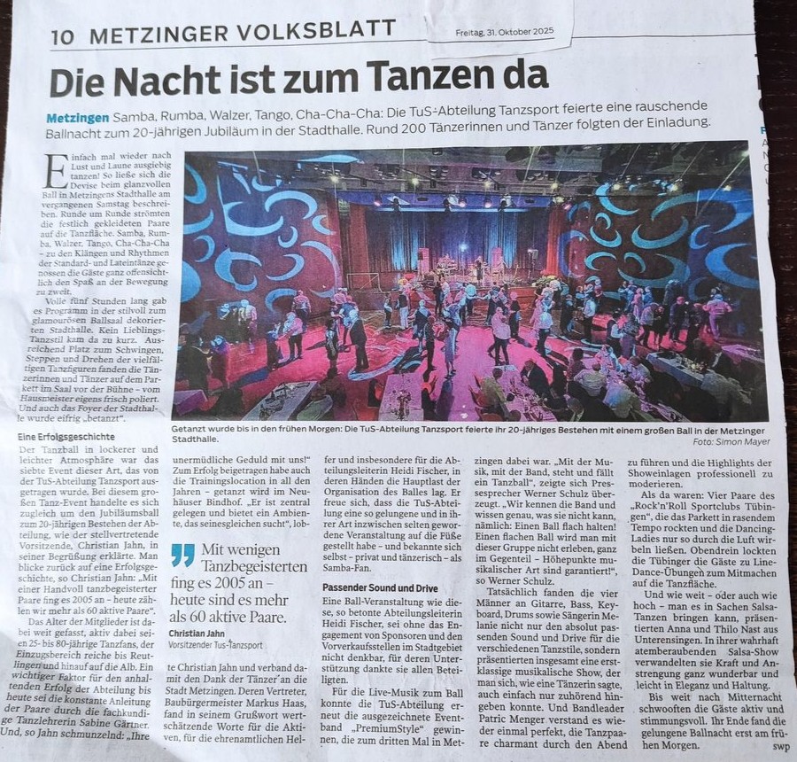 Rund 200 Tänzerinnen und Tänzer folgten der Einladung der TuS-Abteilung Tanzsport zum Jubiläumsball am 25.10. 2025 in die Stadthalle