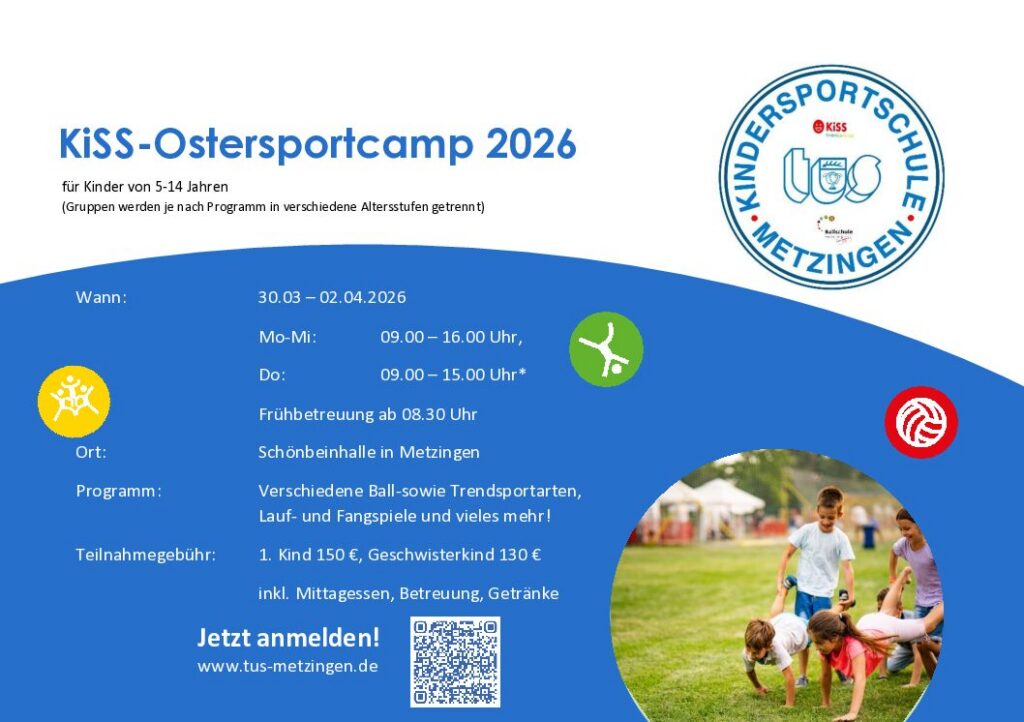 Anmeldung KiSS-Ostersportcamp Das Ostersportcamp von Montag, 30. bis Donnerstag, 02.04.2026 findet in der Schönbeinhalle statt und alle Kinder im Alter von 5-14 Jahren (unabhängig von der Vereinszugehörigkeit) sind hierbei herzlich willkommen! Bei Fragen und für weitere Infos können Sie sich gerne bei Sandra Irion unter kiss-metzingen@outlook.de melden. Die Anmeldung erfolgt über https://docs.google.com/forms/d/e/1FAIpQLSfrl51aEHgBQjL2erY7J_-svyYtKe6NmeiyNx01upLpeSYNeQ/viewform?usp=dialog Oder aber hier über den QR-Code: Nach …