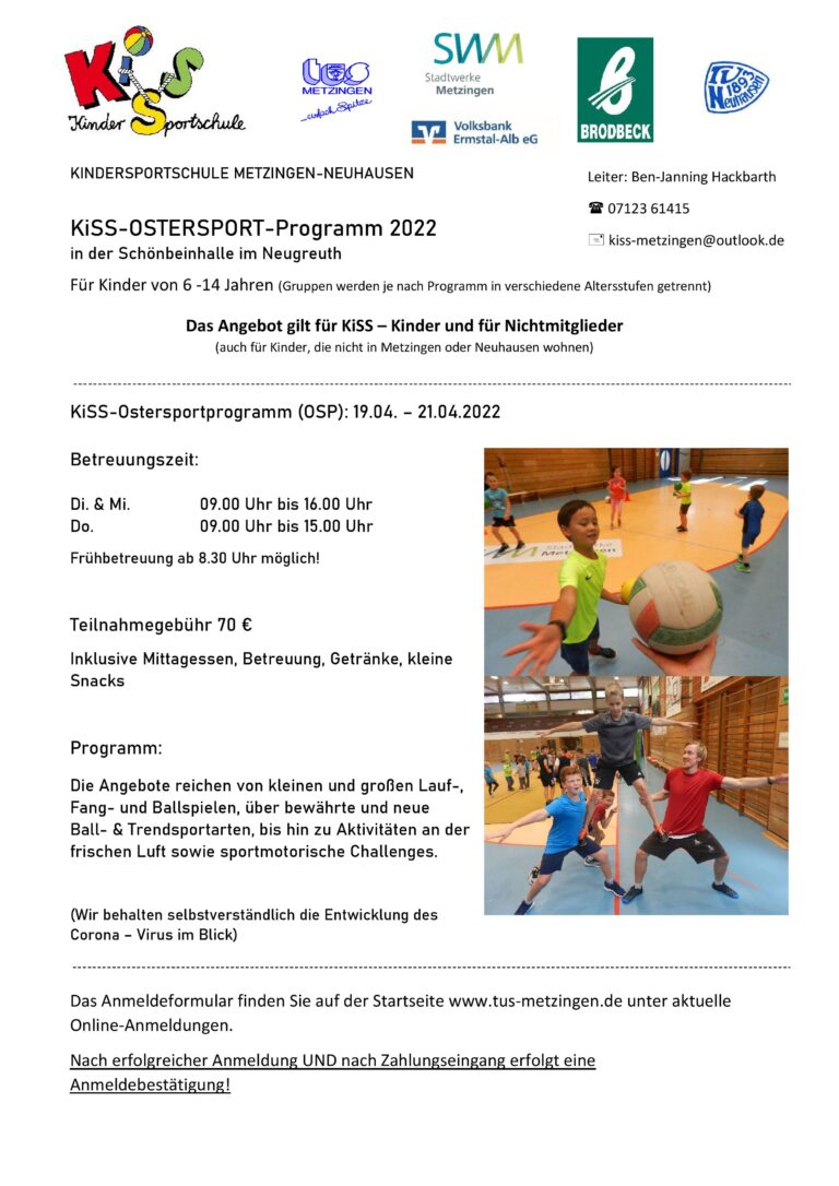 KiSS-Ostersport-Programm 2022 (Flyer bereits online) 3 Tage in der Schönbeinhalle vom 19.04. bis 21.04.2022 jeweils von 9:00 bis 16:00/ 15:00…